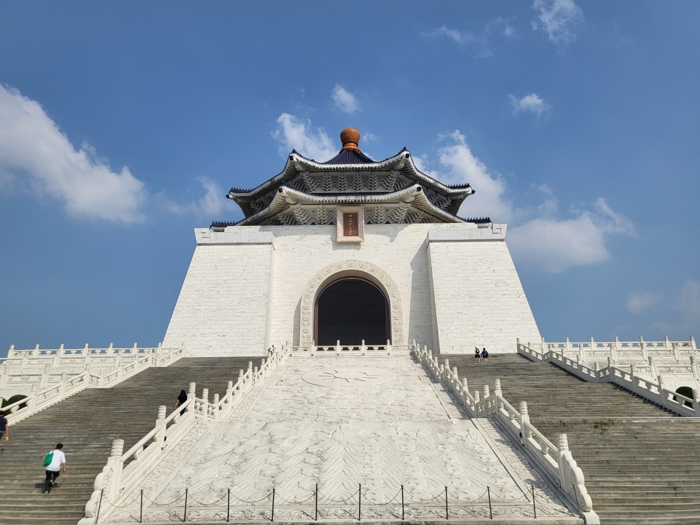 25톤의 장개석 총통 동상이 본관에서 시내를 바라보고 있으며, 1층 전시실에는 사진과 총통의 생애에 관한 기념품 등이 전시되어 있다. 기념당의 높이는 70m이며, 중화 문화의 품격을 잘 반영하고 있는 건축물입니다. 외부는 청색과 흰색 두 가지를 주로 하고 있는데 이 색들은 자유와 평등을 상징하고 우아한 명나라식의 아치가 정문이며 양측에 두 개의 고전적 건물이 있는데 각각 국립극장과 콘서트 홀입니다.