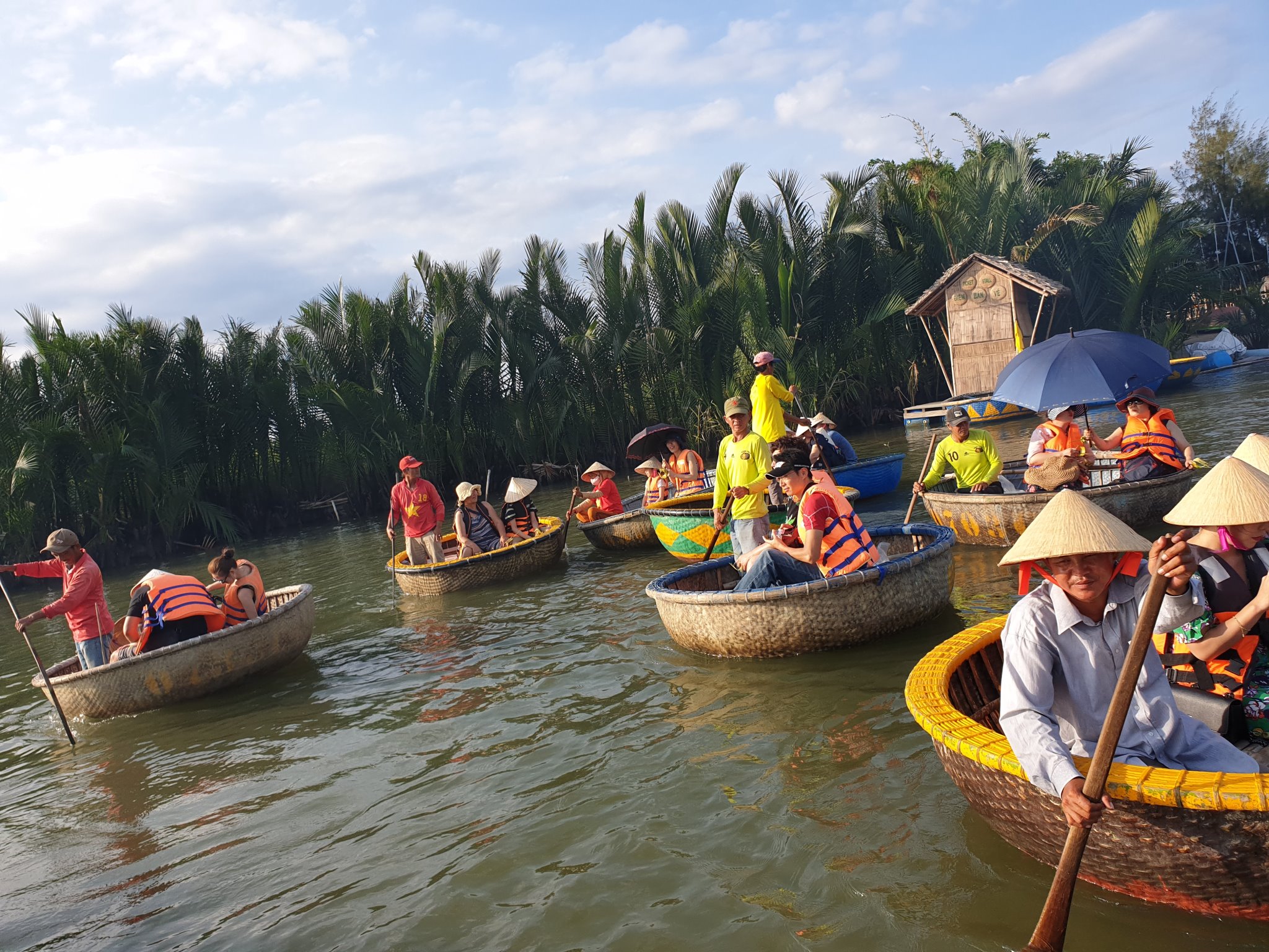 #바구니배 체험 바구니배는 프랑스 식민지 시절, 어선에 부과되는 세금을 피하기 위해 베트남 어부들이 대나무로 만들어 사용하기 시작한 둥근 모양의 배입니다. 지금은 주로 호이안 지역의 투본강에서 관광객들에게 이색적인 체험을 제공하는 인기 있는 투어로 자리 잡았으며, 사공이 배를 돌리는 퍼포먼스로 특별한 추억을 선사합니다.