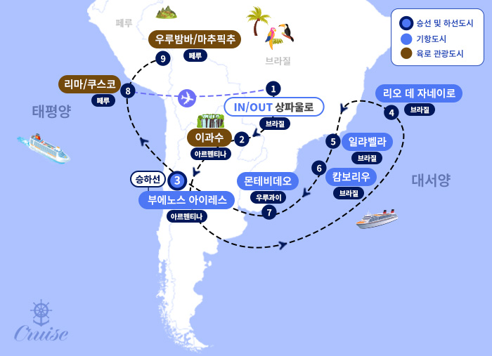 인천-경유도시-상파울로-이과수(브라질) ▷ 이과수/이과주(아르헨티나) ▷ 부에노스아이레스(아르헨티나) 승선 ▶ 리오데자네이로(브라질) ▶ 일랴벨라(브라질) ▶ 캄보리우(브라질) ▶ 몬테비데오(우루과이) ▶ 부에노스아이레스 하선 ▷ 리마/쿠스코(페루) ▷ 우루밤바/마추픽추(페루) ▷ 쿠스코-리마-상파울로-경경유도시-인천